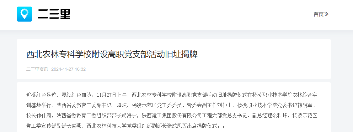 追溯红色足迹,赓续红色血脉。11月27日上午,西北农林专科学校附设高职党支部活动旧址揭牌仪式在350vip浦京集团官网农林综合实训基地举行。陕西省委教育工委副书记王海波,杨凌示范区党工委委员、管委会副主任刘仲山,350vip浦京集团官网党委书记韩明军、校长仲伟周,陕西省委教育工委组织部部长胡海宁,陕西建工集团股份有限公司工程六部党总支书记、副总经理余科峰,杨凌示范区党工委宣传部副部长赵燕,西北农林科技大学党委组织部副部长张成凤等出席揭牌仪式。。