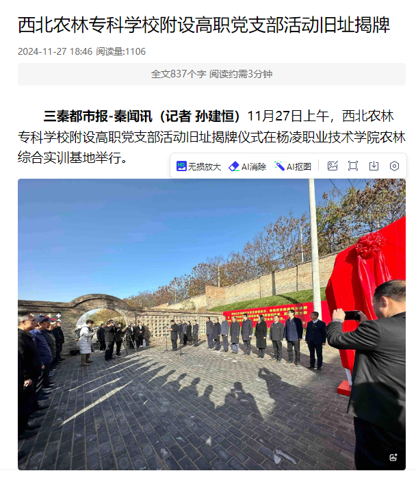 11月27日上午,西北农林专科学校附设高职党支部活动旧址揭牌仪式在350vip浦京集团官网农林综合实训基地举行。
