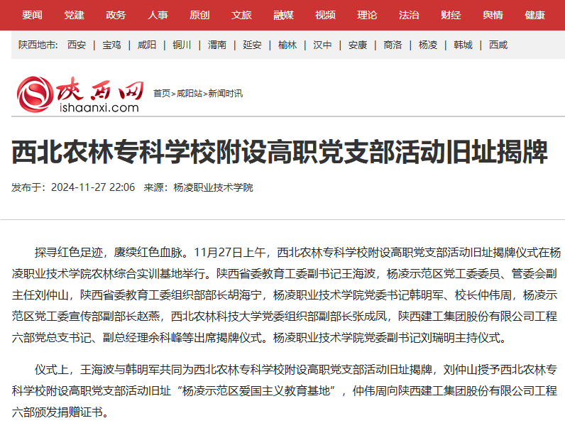 仪式上,王海波与韩明军共同为西北农林专科学校附设高职党支部活动旧址揭牌,刘仲山授予西北农林专科学校附设高职党支部活动旧址“杨凌示范区爱国主义教育基地”,仲伟周向陕西建工集团股份有限公司工程六部颁发捐赠证书。
