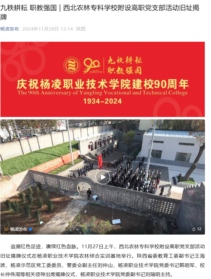 仪式上,王海波与韩明军共同为西北农林专科学校附设高职党支部活动旧址揭牌,刘仲山授予西北农林专科学校附设高职党支部活动旧址“杨凌示范区爱国主义教育基地”铭牌,仲伟周向陕西建工集团股份有限公司工程六部颁发捐赠证书。