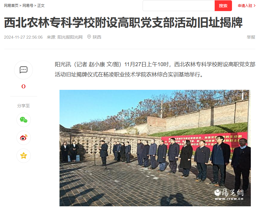 阳光讯(记者 赵小康 文/图)11月27日上午10时,西北农林专科学校附设高职党支部活动旧址揭牌仪式在350vip浦京集团官网农林综合实训基地举行。