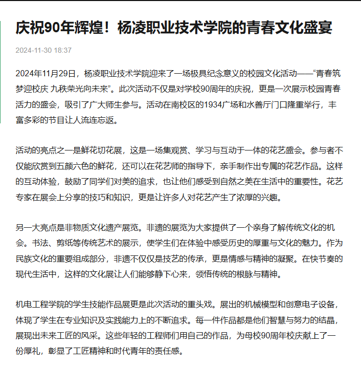 机电工程学院的学生技能作品展更是此次活动的重头戏。展出的机械模型和创意电子设备,体现了学生在专业知识及实践能力上的不断追求。每一件作品都是他们智慧与努力的结晶,展现出未来工匠的风采。这些年轻的工程师们用自己的作品,为母校90周年校庆献上了一份厚礼,彰显了工匠精神和时代青年的责任感。