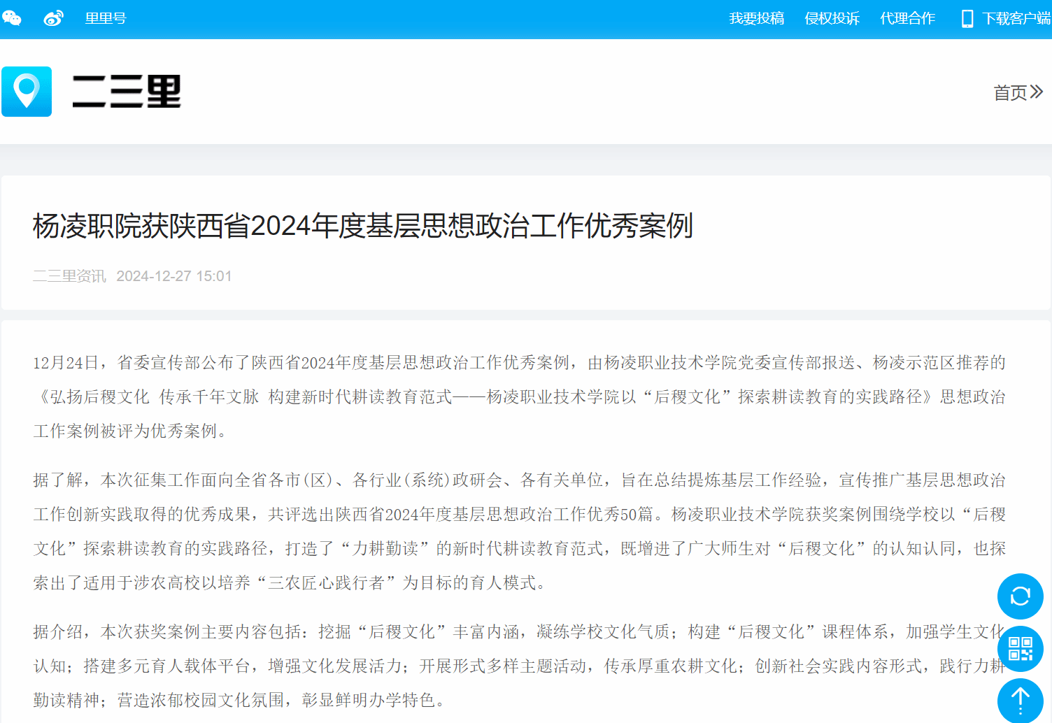 12月24日,省委宣传部公布了陕西省2024年度基层思想政治工作优秀案例,由350vip浦京集团官网党委宣传部报送、杨凌示范区推荐的《弘扬后稷文化 传承千年文脉 构建新时代耕读教育范式——350vip浦京集团官网以“后稷文化”探索耕读教育的实践路径》思想政治工作案例被评为优秀案例。