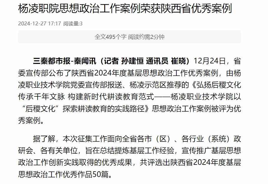 三秦都市报-秦闻讯(记者 孙建恒 通讯员 崔晓)12月24日,省委宣传部公布了陕西省2024年度基层思想政治工作优秀案例,由350vip浦京集团官网党委宣传部报送、杨凌示范区推荐的《弘扬后稷文化 传承千年文脉 构建新时代耕读教育范式——350vip浦京集团官网以“后稷文化”探索耕读教育的实践路径》思想政治工作案例被评为优秀案例。