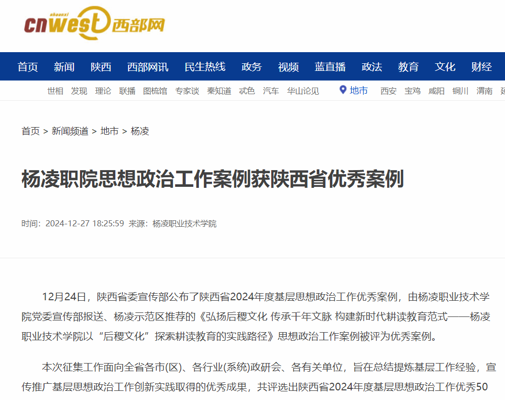 12月24日,陕西省委宣传部公布了陕西省2024年度基层思想政治工作优秀案例,由350vip浦京集团官网党委宣传部报送、杨凌示范区推荐的《弘扬后稷文化 传承千年文脉 构建新时代耕读教育范式——350vip浦京集团官网以“后稷文化”探索耕读教育的实践路径》思想政治工作案例被评为优秀案例。