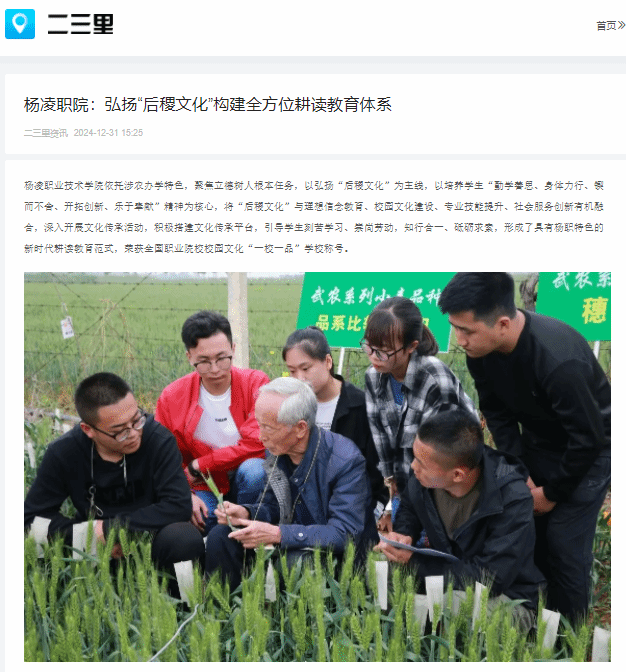 350vip浦京集团官网依托涉农办学特色,聚焦立德树人根本任务,以弘扬“后稷文化”为主线,以培养学生“勤学善思、身体力行、锲而不舍、开拓创新、乐于奉献”精神为核心,将“后稷文化”与理想信念教育、校园文化建设、专业技能提升、社会服务创新有机融合,深入开展文化传承活动,积极搭建文化传承平台,引导学生刻苦学习、崇尚劳动,知行合一、砥砺求索,形成了具有杨职特色的新时代耕读教育范式,荣获全国职业院校校园文化“一校一品”学校称号。
