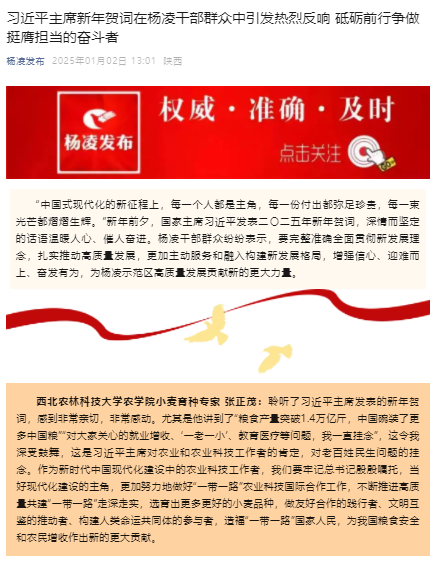 “中国式现代化的新征程上,每一个人都是主角,每一份付出都弥足珍贵,每一束光芒都熠熠生辉。”新年前夕,国家主席习近平发表二〇二五年新年贺词,深情而坚定的话语温暖人心、催人奋进。杨凌干部群众纷纷表示,要完整准确全面贯彻新发展理念,扎实推动高质量发展,更加主动服务和融入构建新发展格局,增强信心、迎难而上、奋发有为,为杨凌示范区高质量发展贡献新的更大力量。