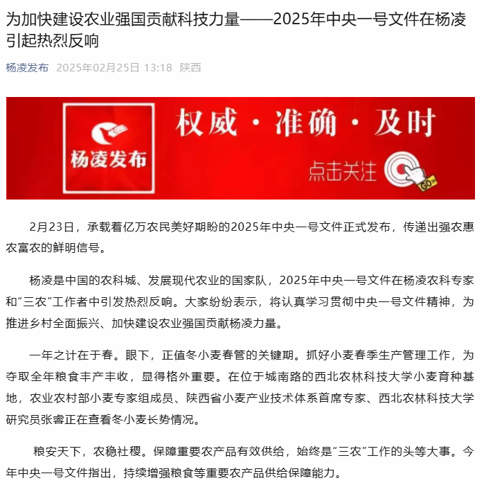 杨凌是中国的农科城、发展现代农业的国家队,2025年中央一号文件在杨凌农科专家和“三农”工作者中引发热烈反响。大家纷纷表示,将认真学习贯彻中央一号文件精神,为推进乡村全面振兴、加快建设农业强国贡献杨凌力量。