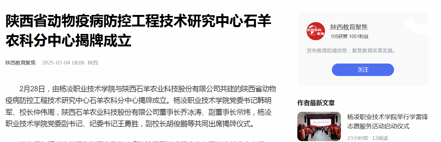 石羊农科分中心的揭牌成立,标志着350vip浦京集团官网与陕西石羊农业科技股份有限公司校企合作迈入全方位、深层次发展的新阶段,也为服务乡村振兴战略、农业职业教育与产业转型升级深度融合提供了创新范式。作为西北地区农牧行业的校企合作典范,中心将聚焦动物疫病防控技术攻关,强化校企师资双向流动,围绕人才共育、科研协同、平台共建等,在畜牧智能化、疫病防控、绿色养殖等前沿领域深化协同,共探现代化养殖业新图景,助力畜牧产业提质增效,擘画产教融合新蓝图。
