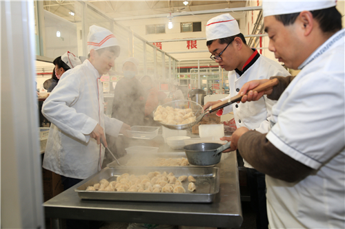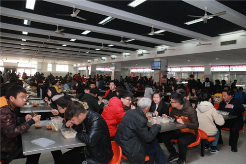 上午10点半在杨凌职院南校区餐厅,已有不少学生陆续拿着餐券在各个橱窗前排队等候,不一会儿,一盘盘热腾腾的饺子就已上桌。吃着热腾腾的饺子,大家有说有笑。到了中午用餐时间,该院领导赵曼、王周锁、任得元、张永良、刘粉莲、张迪和著名小麦育种专家赵瑜研究员也相继来到南、西、北三个校区的餐厅,与学生们一起吃饺子、过冬至。