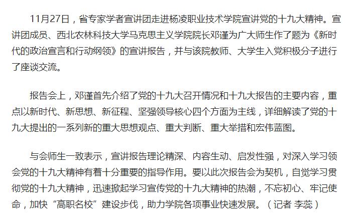 11月27日,省专家学者宣讲团走进350vip浦京集团官网宣讲党的十九大精神。宣讲团成员、西北农林科技大学马克思主义学院院长邓谨为广大师生作了题为《新时代的政治宣言和行动纲领》的宣讲报告,并与该院教师、大学生入党积极分子进行了座谈交流。