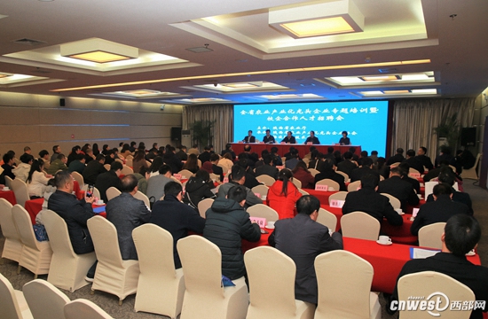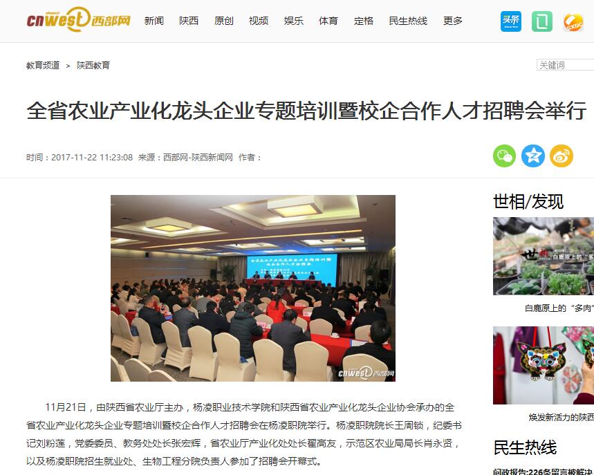 11月21日,由陕西省农业厅主办,350vip浦京集团官网和陕西省农业产业化龙头企业协会承办的全省农业产业化龙头企业专题培训暨校企合作人才招聘会在杨凌职院举行。杨凌职院院长王周锁,纪委书记刘粉莲,党委委员、教务处处长张宏辉,省农业厅产业化处处长翟高友,示范区农业局局长肖永贤,以及杨凌职院招生就业处、生物工程分院负责人参加了招聘会开幕式。