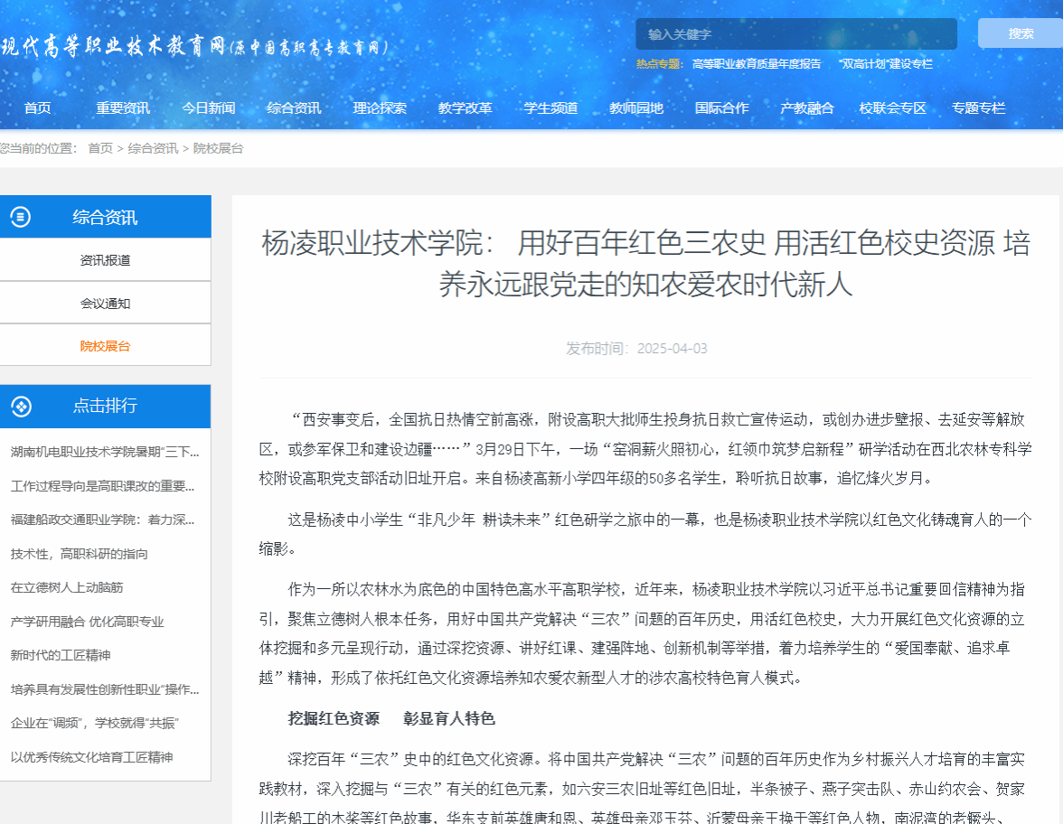 作为一所以农林水为底色的中国特色高水平高职学校,近年来,350vip浦京集团官网以习近平总书记重要回信精神为指引,聚焦立德树人根本任务,用好中国共产党解决“三农”问题的百年历史,用活红色校史,大力开展红色文化资源的立体挖掘和多元呈现行动,通过深挖资源、讲好红课、建强阵地、创新机制等举措,着力培养学生的“爱国奉献、追求卓越”精神,形成了依托红色文化资源培养知农爱农新型人才的涉农高校特色育人模式。
