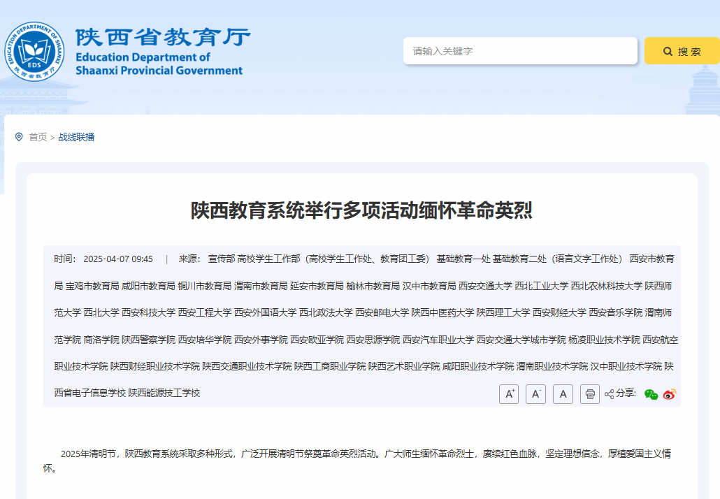 2025年清明节,陕西教育系统采取多种形式,广泛开展清明节祭奠革命英烈活动。广大师生缅怀革命烈士,赓续红色血脉,坚定理想信念,厚植爱国主义情怀。