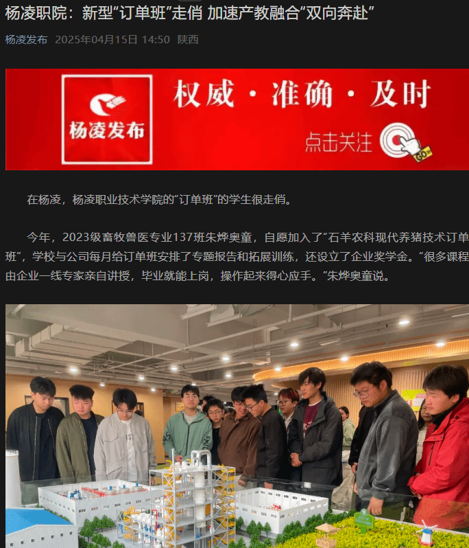 这是杨凌首次探索“双主体、双循环、递进式”职教班,不同于以往校企合作的“你培养,我接收”模式,校企双方共同制订人才培养方案,构建“基础理论+健康养殖+智能设备操作+疫病防控+管理能力”五模块课程体系,将企业技术标准(如智能猪场SOP)融入教学,实现了人才培养与产业需求的精准对接,既解决了行业人才短缺问题,又为学生提供了优质的就业通道。