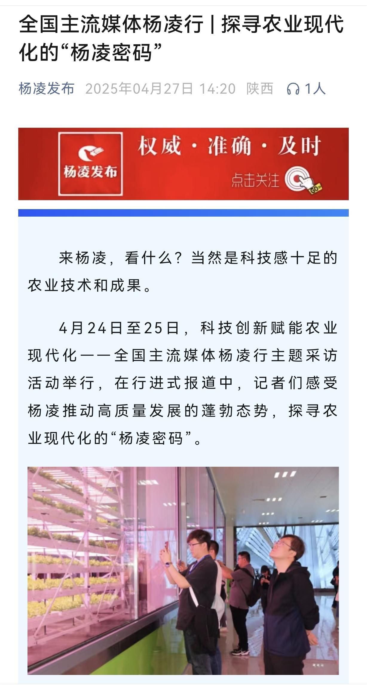 4月24日至25日,科技创新赋能农业现代化——全国主流媒体杨凌行主题采访活动举行,在行进式报道中,记者们感受杨凌推动高质量发展的蓬勃态势,探寻农业现代化的“杨凌密码”。