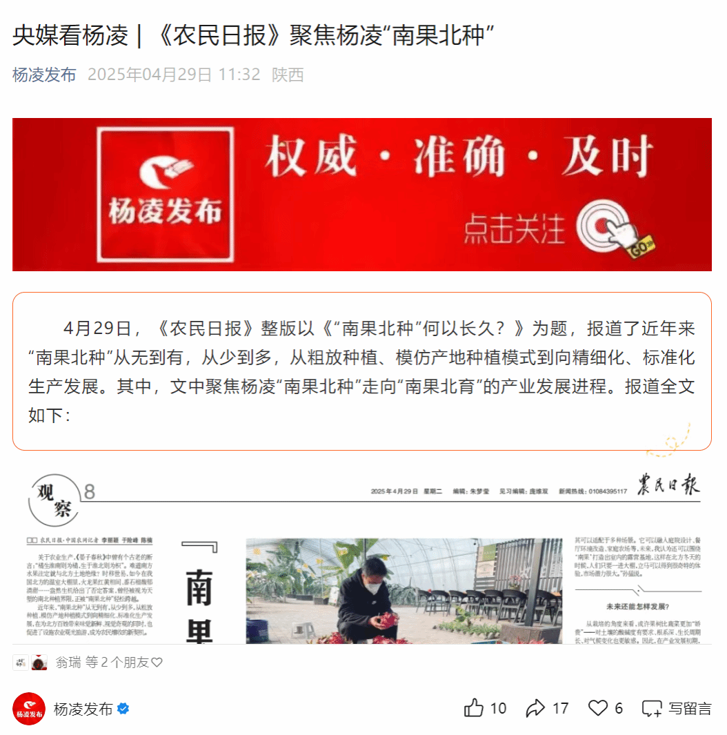 4月29日,《农民日报》整版以《“南果北种”何以长久?》为题,报道了近年来“南果北种”从无到有,从少到多,从粗放种植、模仿产地种植模式到向精细化、标准化生产发展。其中,文中聚焦杨凌“南果北种”走向“南果北育”的产业发展进程。报道全文如下: