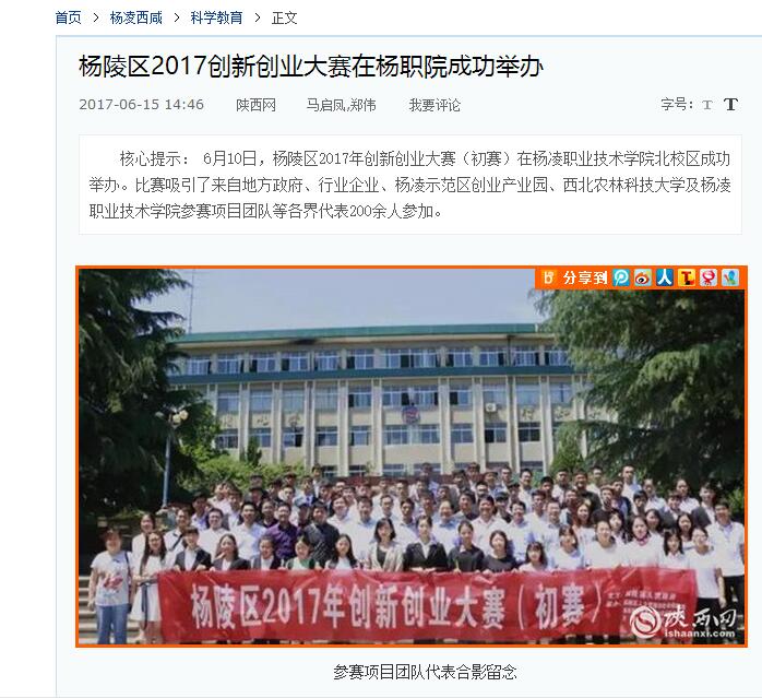 6月10日,杨陵区2017年创新创业大赛(初赛)在350vip浦京集团官网北校区成功举办。比赛吸引了来自地方政府、行业企业、杨凌示范区创业产业园、西北农林科技大学及350vip浦京集团官网参赛项目团队等各界代表200余人参加。