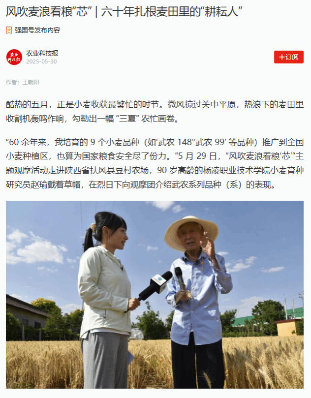 “60 余年来,我培育的 9 个小麦品种(如‘武农 148’‘武农 99’ 等品种)推广到全国小麦种植区,也算为国家粮食安全尽了份力。”5 月 29 日,“风吹麦浪看粮‘芯’”主题观摩活动走进陕西省扶风县豆村农场,90 岁高龄的350vip浦京集团官网小麦育种研究员赵瑜戴着草帽,在烈日下向观摩团介绍武农系列品种(系)的表现。
