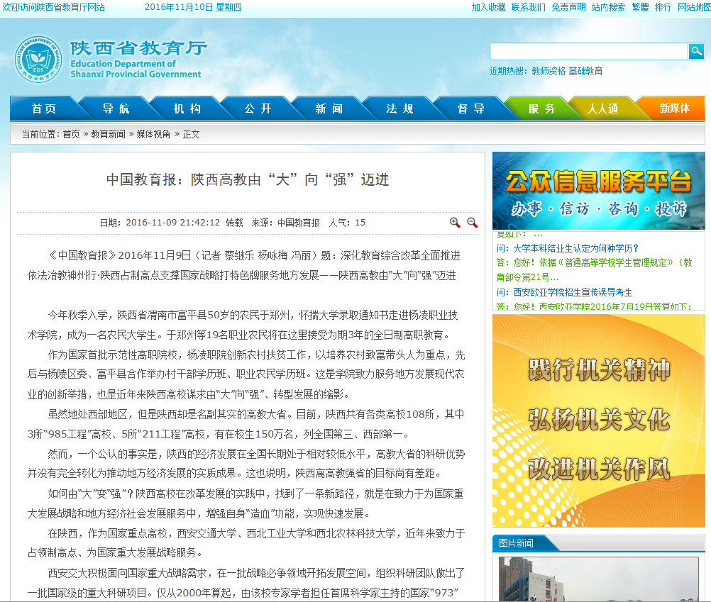 《中国教育报》2016年11月9日(记者 蔡继乐 杨咏梅 冯丽)题:深化教育综合改革全面推进依法治教神州行·陕西占制高点支撑国家战略打特色牌服务地方发展——陕西高教由“大”向“强”迈进