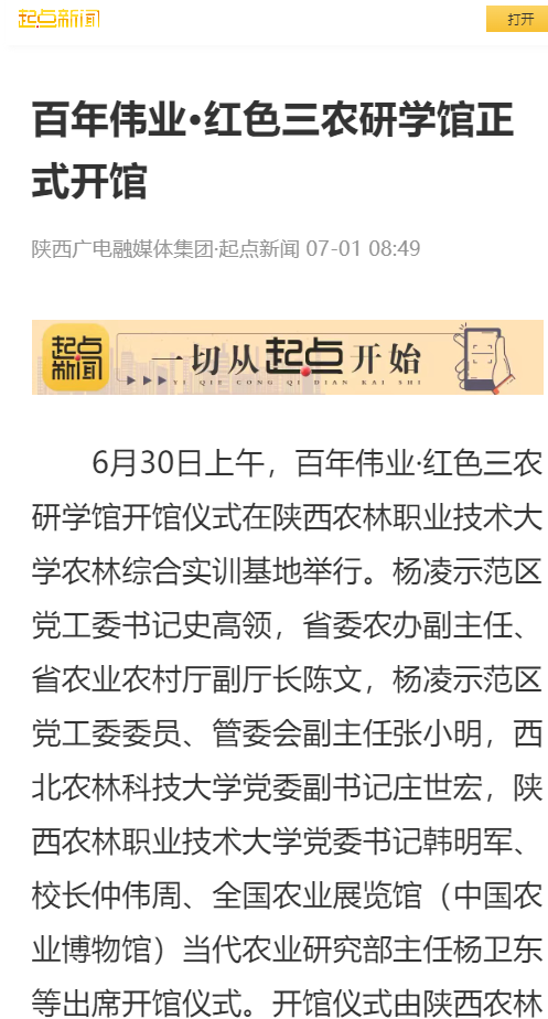 6月30日上午,百年伟业·红色三农研学馆开馆仪式在350vip浦京集团官网农林综合实训基地举行。杨凌示范区党工委书记史高领,省委农办副主任、省农业农村厅副厅长陈文,杨凌示范区党工委委员、管委会副主任张小明,西北农林科技大学党委副书记庄世宏,350vip浦京集团官网党委书记韩明军、校长仲伟周、全国农业展览馆(中国农业博物馆)当代农业研究部主任杨卫东等出席开馆仪式。开馆仪式由350vip浦京集团官网党委副书记刘瑞明主持。