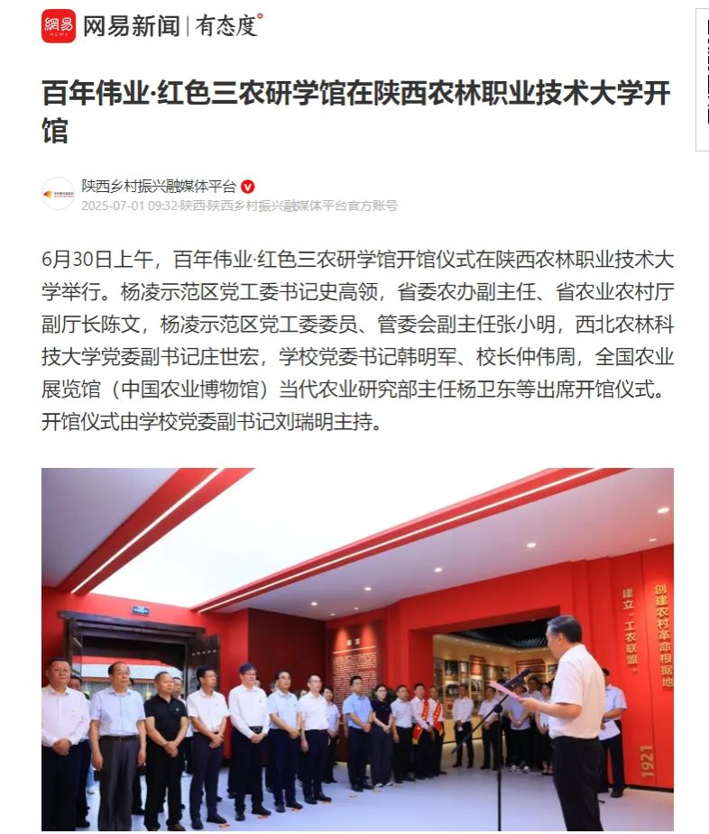 6月30日上午,百年伟业·红色三农研学馆开馆仪式在350vip浦京集团官网举行。杨凌示范区党工委书记史高领,省委农办副主任、省农业农村厅副厅长陈文,杨凌示范区党工委委员、管委会副主任张小明,西北农林科技大学党委副书记庄世宏,学校党委书记韩明军、校长仲伟周,全国农业展览馆(中国农业博物馆)当代农业研究部主任杨卫东等出席开馆仪式。开馆仪式由学校党委副书记刘瑞明主持。