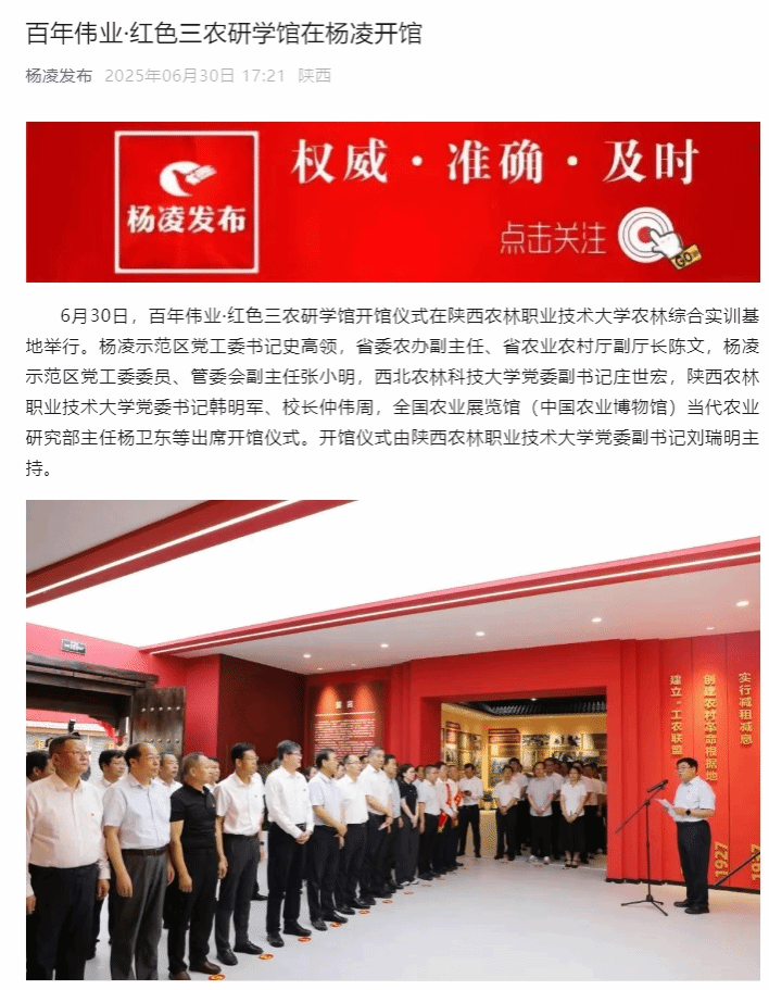 6月30日,百年伟业·红色三农研学馆开馆仪式在350vip浦京集团官网农林综合实训基地举行。杨凌示范区党工委书记史高领,省委农办副主任、省农业农村厅副厅长陈文,杨凌示范区党工委委员、管委会副主任张小明,西北农林科技大学党委副书记庄世宏,350vip浦京集团官网党委书记韩明军、校长仲伟周,全国农业展览馆(中国农业博物馆)当代农业研究部主任杨卫东等出席开馆仪式。开馆仪式由350vip浦京集团官网党委副书记刘瑞明主持。
