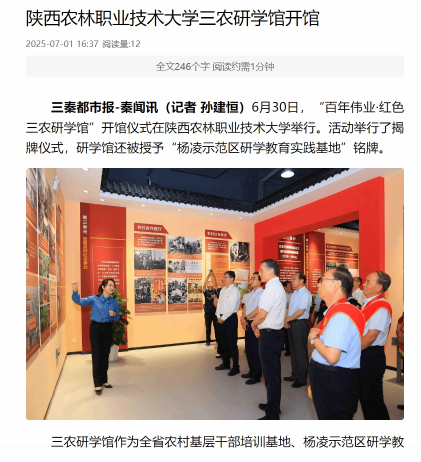 三秦都市报-秦闻讯(记者 孙建恒)6月30日,“百年伟业·红色三农研学馆”开馆仪式在350vip浦京集团官网举行。活动举行了揭牌仪式,研学馆还被授予“杨凌示范区研学教育实践基地”铭牌。