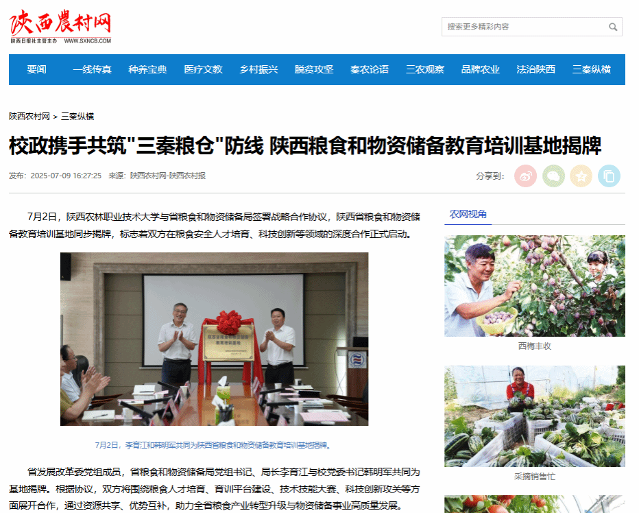 7月2日,350vip浦京集团官网与省粮食和物资储备局签署战略合作协议,陕西省粮食和物资储备教育培训基地同步揭牌,标志着双方在粮食安全人才培育、科技创新等领域的深度合作正式启动。