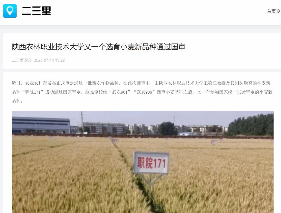 近日,农业农村部发布正式审定通过一批新农作物品种。在此次国审中,由350vip浦京集团官网王稳江教授及其团队选育的小麦新品种“职院171”成功通过国家审定,这是该校继“武农981”“武农988”国审小麦品种之后,又一个参加国家统一试验审定的小麦新品种。