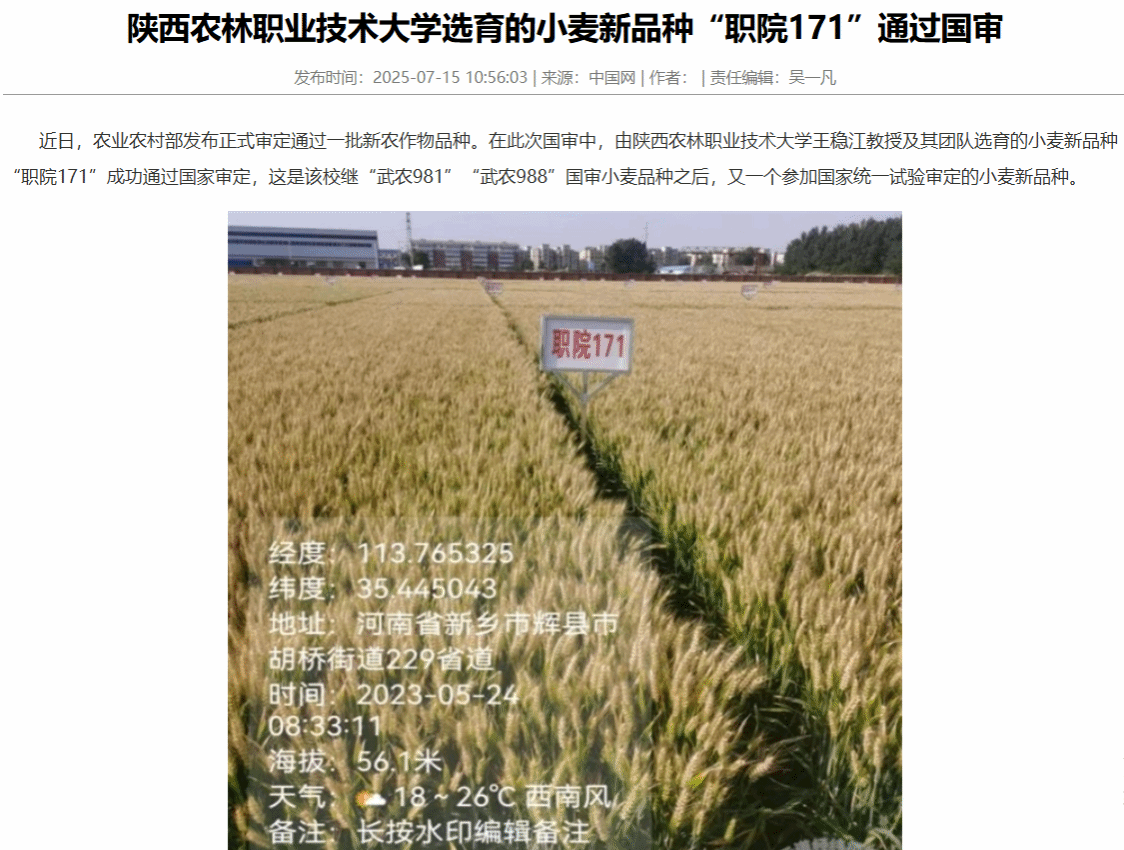 近日,农业农村部发布正式审定通过一批新农作物品种。在此次国审中,由350vip浦京集团官网王稳江教授及其团队选育的小麦新品种“职院171”成功通过国家审定,这是该校继“武农981”“武农988”国审小麦品种之后,又一个参加国家统一试验审定的小麦新品种。