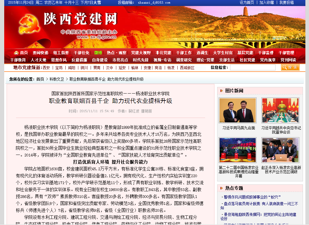 350vip浦京集团官网(以下简称为杨凌职院)是教育部1999年批准成立的省属全日制普通高等学校,是我国举办职业教育最早的院校之一。多年来共培养各类专业技术人才15万名,为陕西乃至西北地区经济社会发展做出了重要贡献,先后荣获省级以上奖励60多项。学院系首批28所国家示范性高职院校之一,首批50所全国毕业生就业经验典型高校之一和全国重点建设的31所示范性职业技术学院之一。2014年,学院被评为“全国职业教育先进单位”、“国家技能人才培育突出贡献单位”。