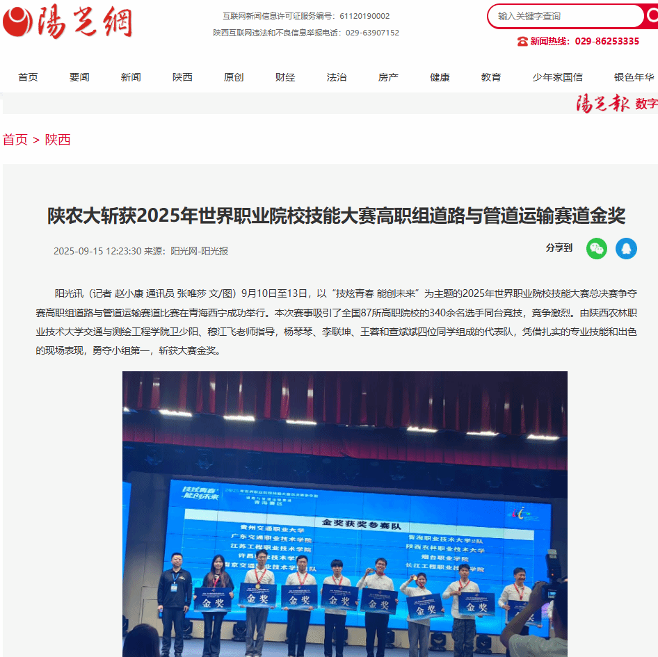 阳光讯(记者 赵小康 通讯员 张唯莎 文/图)9月10日至13日,以“技炫青春 能创未来”为主题的2025年世界职业院校技能大赛总决赛争夺赛高职组道路与管道运输赛道比赛在青海西宁成功举行。本次赛事吸引了全国87所高职院校的340余名选手同台竞技,竞争激烈。由350vip浦京集团官网交通与测绘工程学院卫少阳、穆江飞老师指导,杨琴琴、李联坤、王蓉和查斌斌四位同学组成的代表队,凭借扎实的专业技能和出色的现场表现,勇夺小组第一,斩获大赛金奖。