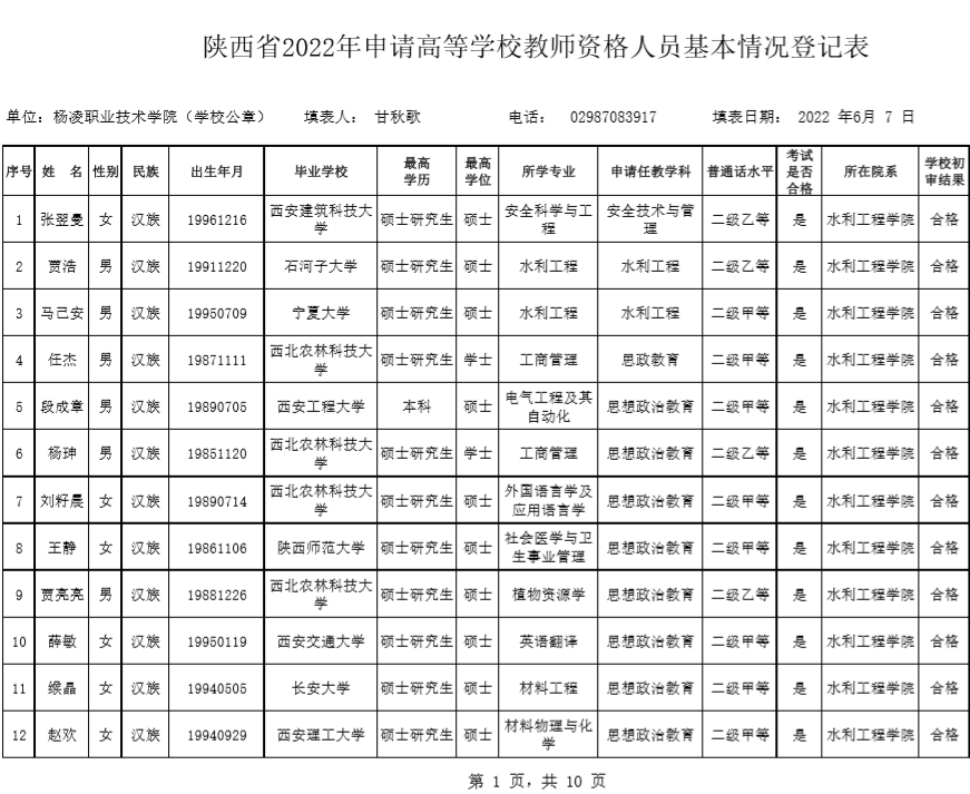 陕西省2022年申请高等学校教师资格人员基本情况登记表(杨凌职院)公示版