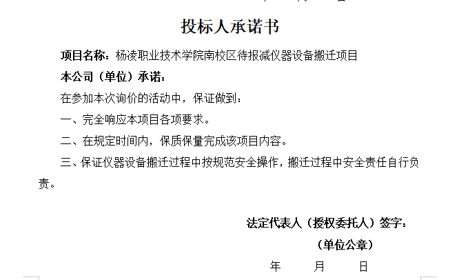 投标供应商须将法人营业执照复印件、投标人身份证复印件、供应商报价单、投标人承诺书等材料加盖公章(不限于上述材料,也可自行增加)用档案袋密封后加盖公司印章,于2023年5月12日10:00前,将资料递交到杨凌示范区渭惠路24号后勤保障处204办公室,过期视为无效响应。