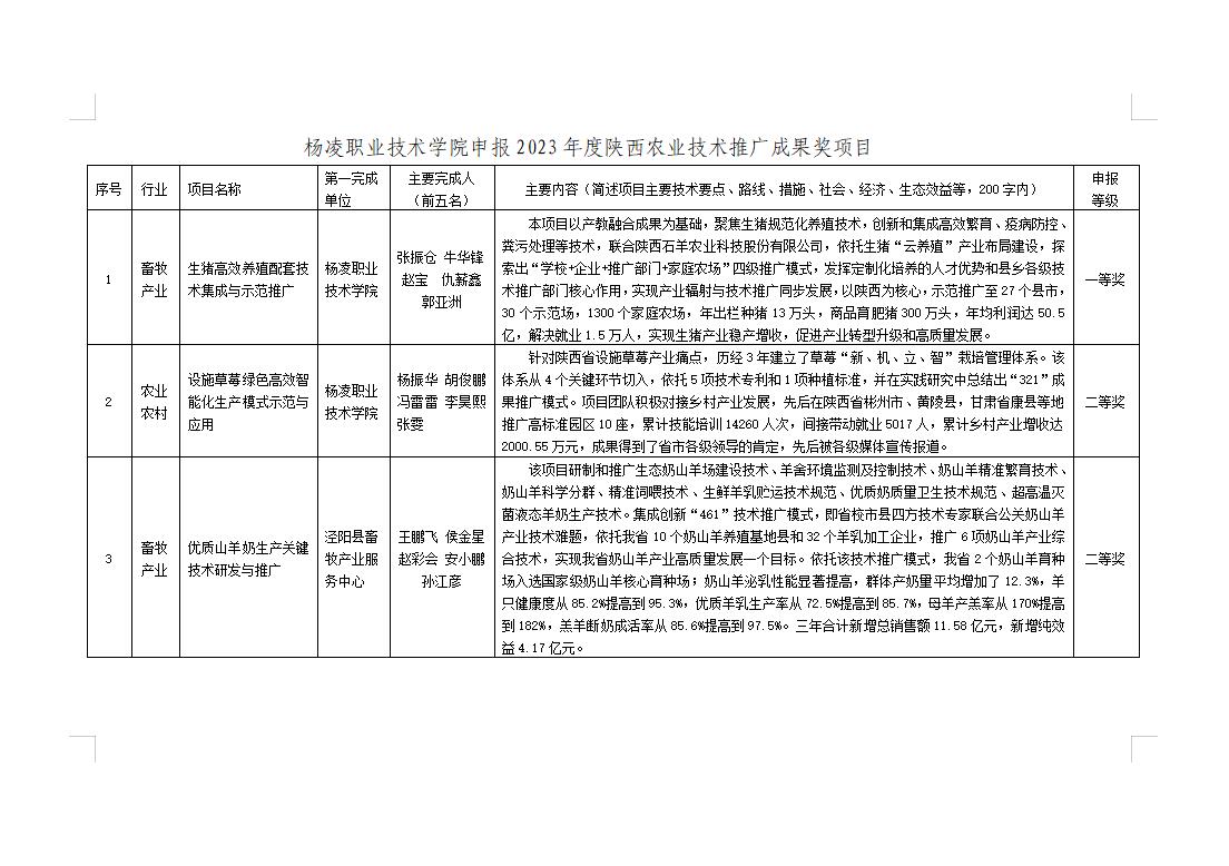 根据陕西省农业农村厅《关于开展2023年度陕西农业技术推广成果奖申报工作的通知》(陕农发〔2023〕31号)要求,现将浦京以第一完成单位、张振仓为第一完成人申报的2023年度陕西农业技术推广成果《生猪高效养殖配套技术集成与示范推广》;浦京以第一完成单位、杨振华为第一完成人申报的2023年度陕西农业技术推广成果《设施草莓绿色高效智能化生产模式示范与应用》;浦京以第二完成单位、侯金星为第二完成人申报的《优质山羊奶生产关键技术研发与推广》项目申报2023年度陕西农业技术推广成果奖,按照项目申报要求,将项目内容予以公示。如对公示内容有异议,请在公示期内向学校办公室反馈。