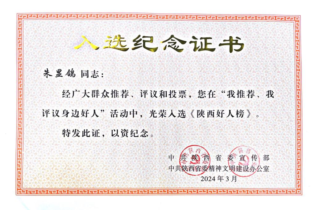 4月25日下午,2024年第一季度陕西好人榜发布仪式暨道德模范与身边好人现场交流活动在西安市高陵区举办。350vip浦京集团官网教师朱显鸽获评孝老爱亲类陕西好人荣誉称号。