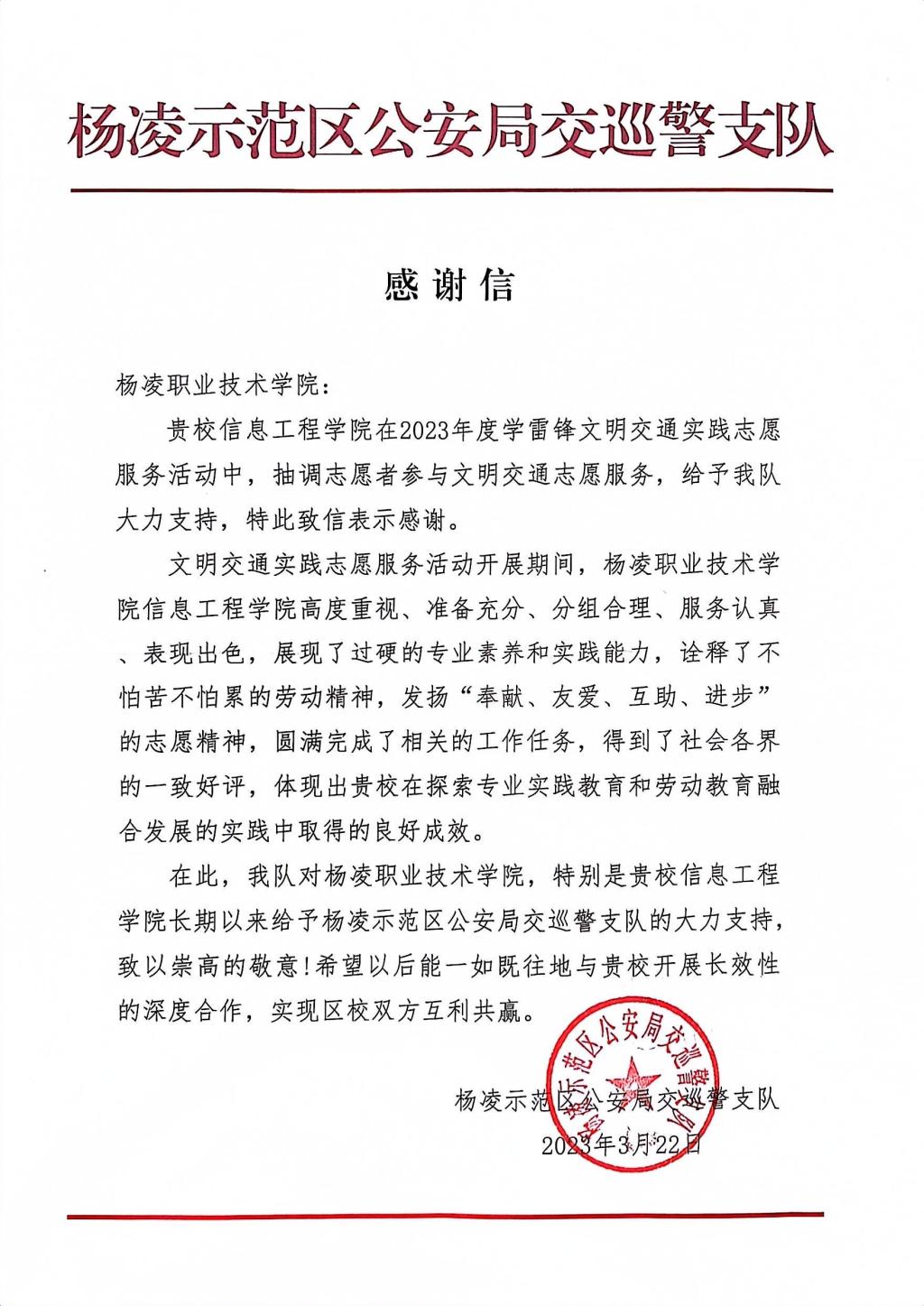 活动期间,杨凌示范区公安局交巡警支队向浦京发来了感谢信,对浦京表示感谢,对志愿者出色的表现进行了表扬,并希望能一如既往地开展长效性的深度合作,实现区校双方互利共赢。志愿者们纷纷表示,将进一步传递文明交通正能量,发挥好新时代志愿者的示范引领作用,大力发扬“奉献、友爱、互助、进步”的志愿精神,在传承雷锋精神中展现杨职青年担当,贡献杨职青年力量。