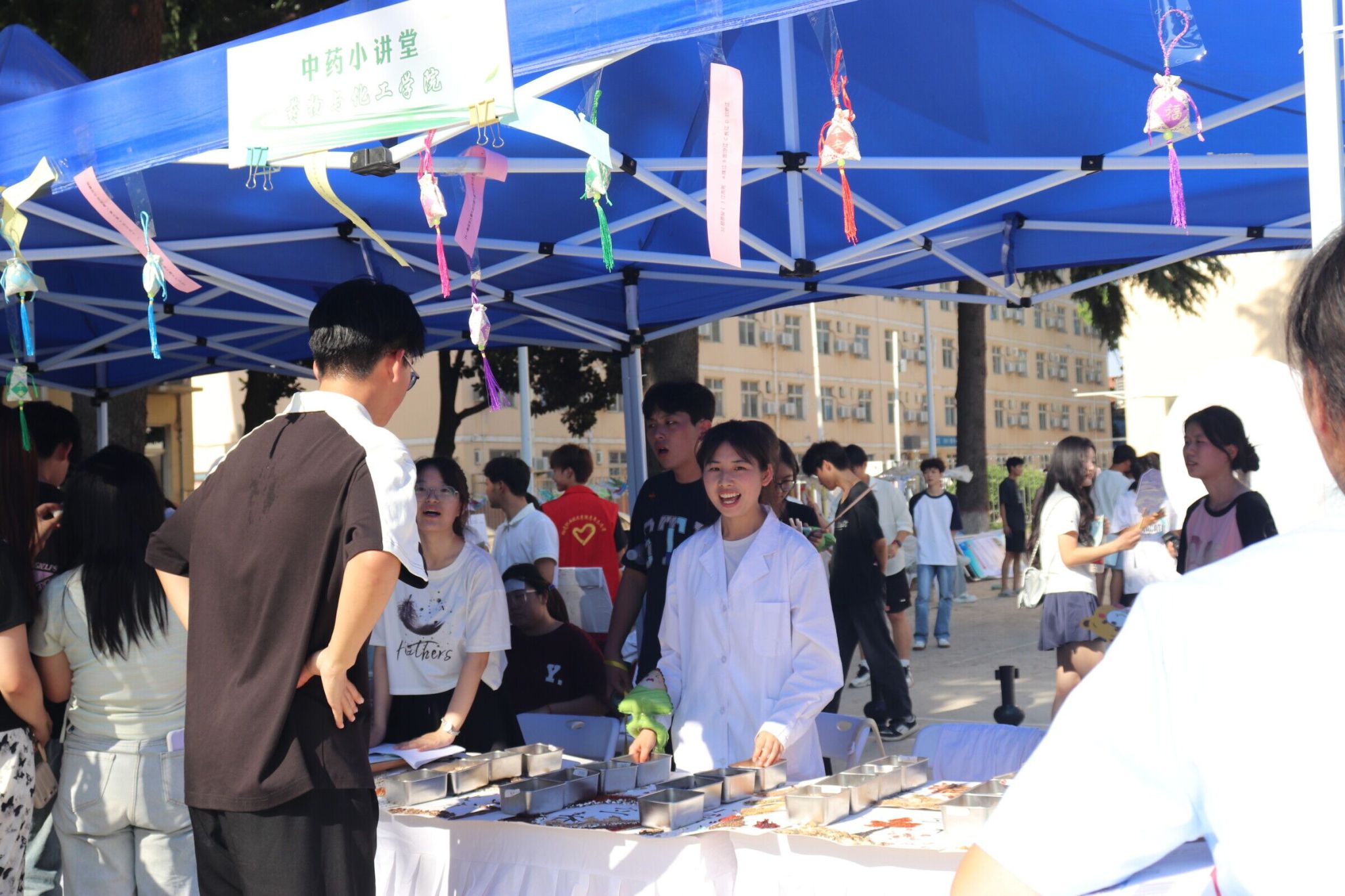 “拾艺端午”非遗技艺体验区亮点纷呈。药物与化工学院“药香廿四候”主题展区,巧妙融合二十四节气与传统中草药智慧,中药制药专业学生带领师生制作含有艾草、陈皮、丁香等中药材的特色香囊。水利工程学院、交通与测绘工程学院现场展示秦砖汉瓦拓印技艺,动物工程学院精心设置非遗缠花工作坊,建筑工程学院开展艾草养生枕制作教学,机电工程学院、旅游与管理学院设置漆扇绘制、帆布包拓印等创意项目。参与者纷纷感慨“像开启了一场穿越千年的文化盲盒之旅”。